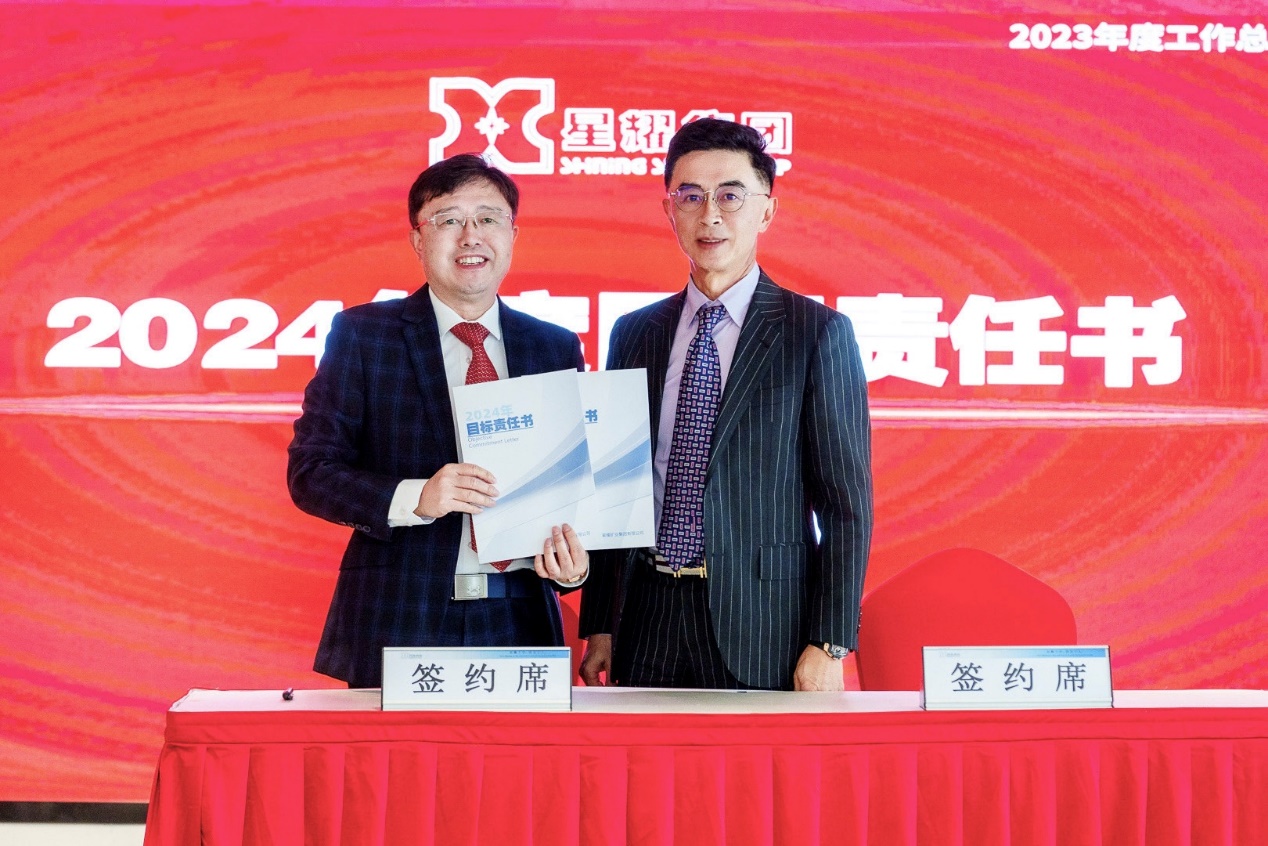 董事长讲话结束后,会议举行了对星耀集团2024年度高层管理人员任命的颁发,以及目标责任书的签订,这一举措明确了新阶段的新目标,对转型后各业务板块的工作提出了新的要求。