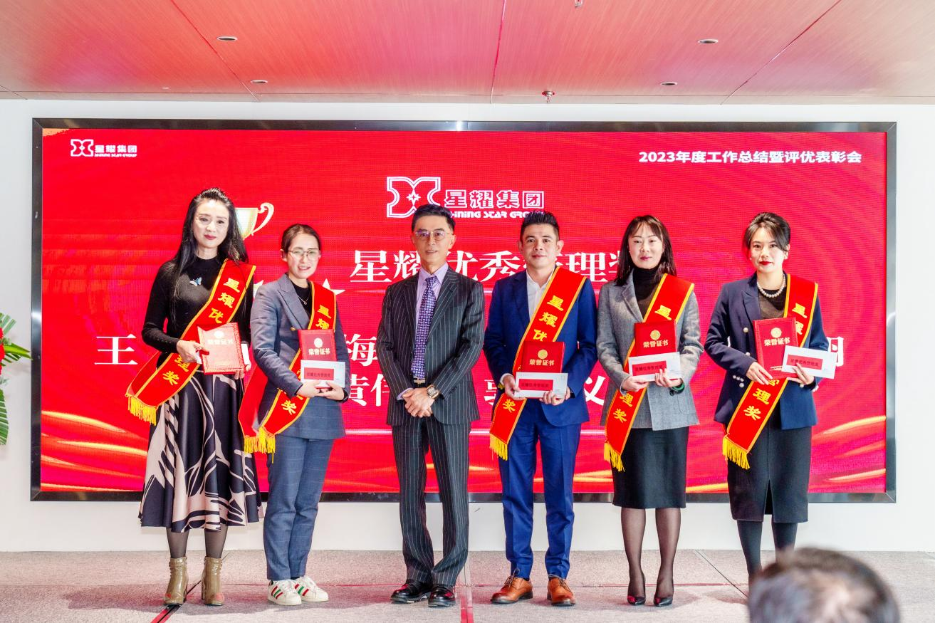 会议最后,宣读了星耀集团2023年度评优表彰的决定。此次评优共设置年度最佳业绩奖和年度优秀团队共二个团队奖项,以及星耀优秀管理奖、优秀员工、优秀党员、优秀团员共计52个奖项,集团颜语董事长及集团各中心领导分别为获奖者颁奖并合影留念。